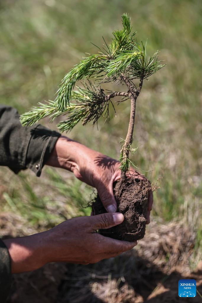 Li Dongkui plants a sapling at a forestry farm in Zhanggutai Town of Zhangwu County, Fuxin City of northeast China's Liaoning Province, June 4, 2025. Li Mingming, secretary of the Communist Party of China branch of Arxiang Village of Zhangwu County, Fuxin City of northeast China's Liaoning Province, is a native of Arxiang. Her father Li Dongkui is a locally renowned forest ranger. (Xinhua/Pan Yulong)