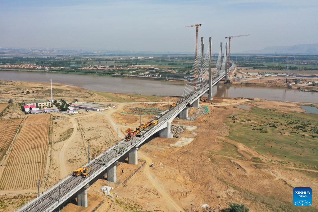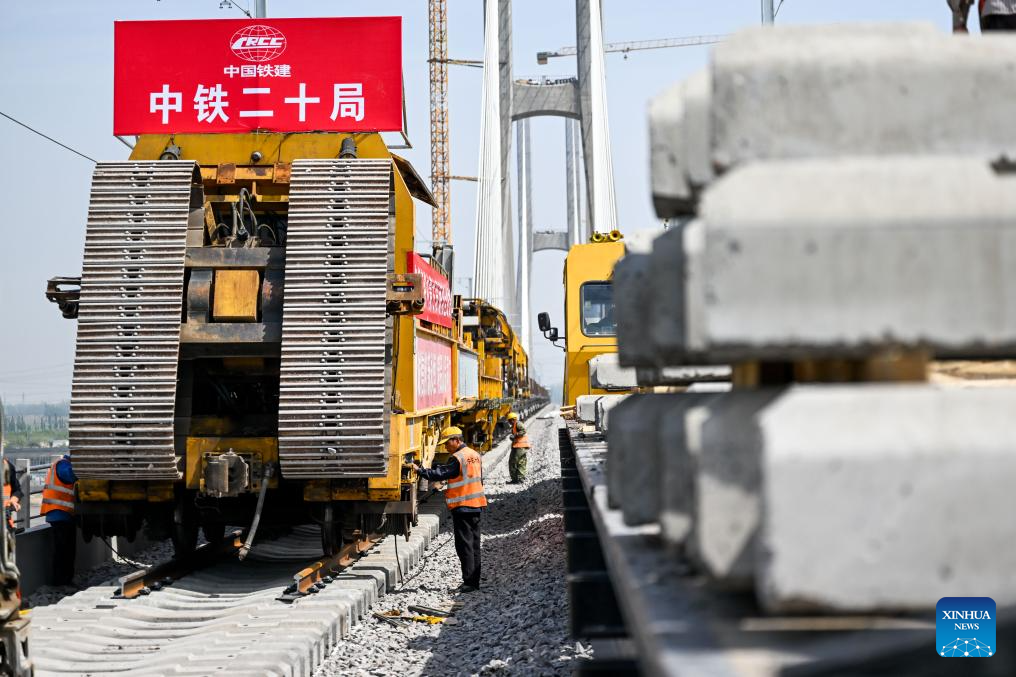 Workers lay steel rails at the construction site of the Wuhai Yellow River grand bridge in north China's Inner Mongolia Autonomous Region, June 6, 2025.