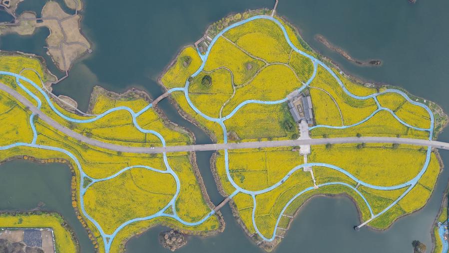 An aerial drone photo taken on March 3, 2025 shows flowering canola fields at a wetland park in Meishan City, southwest China's Sichuan Province. (Photo by Weng Guangjian/Xinhua)
