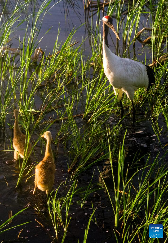 This drone photo taken on June 7, 2025 shows two red-crowned crane chicks following a parent bird in search of food at the Naoli River National Natural Reserve, northeast China's Heilongjiang Province. Located in the heartland of northeast China's Sanjiang Plain, the Naoli River National Natural Reserve is a major habitat for migratory birds in Northeast Asia. (Photo by Sheng Jingli/Xinhua)