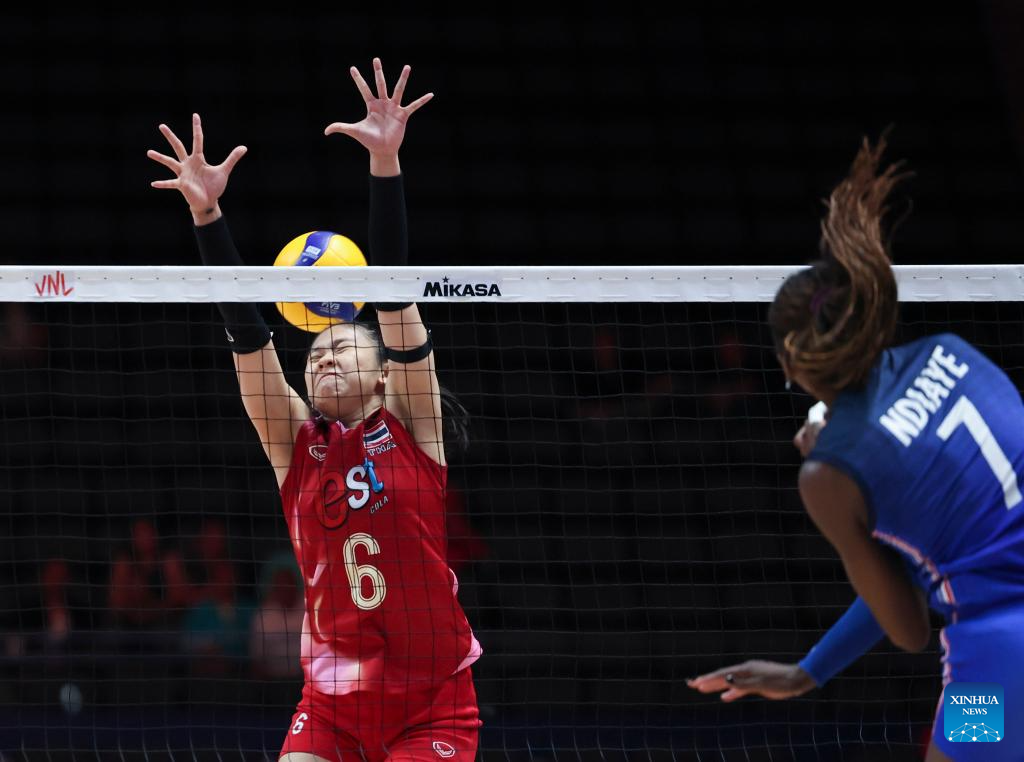 Thailand's Pimpichaya Kokram (C) spikes the ball during the Pool 3 match between France and Thailand at the Women's Volleyball Nations League (VNL) 2025 at the National Indoor Stadium in Beijing, China, June 8, 2025. (Xinhua/Luo Yuan)
