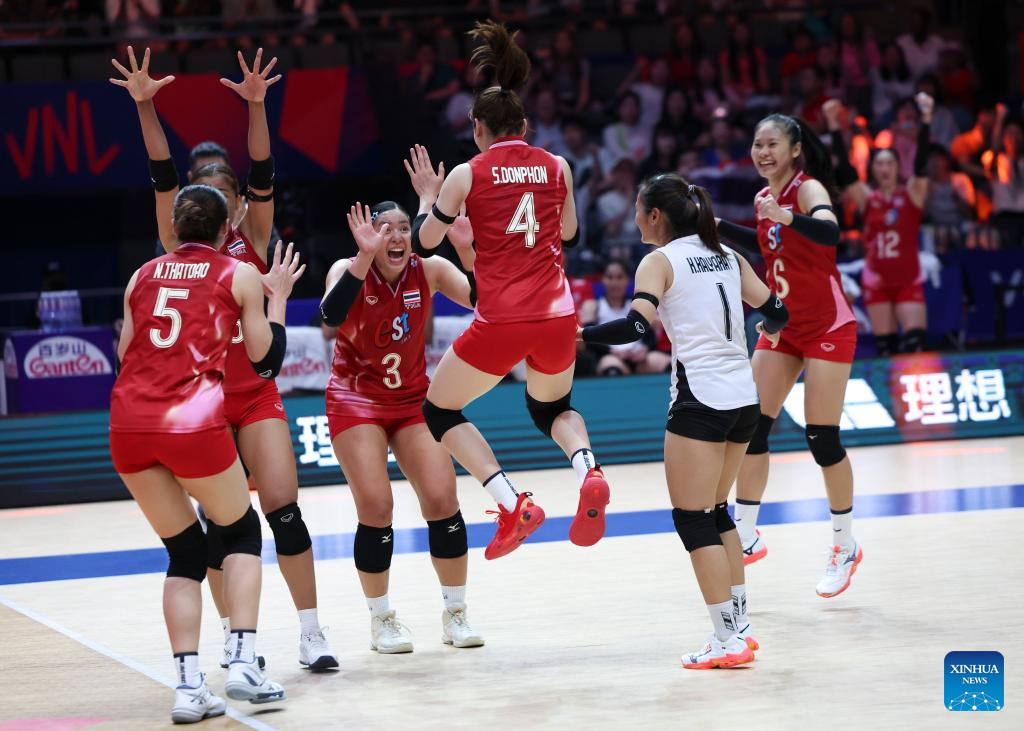 Players of Thailand celebrate winning the Pool 3 match between France and Thailand at the Women's Volleyball Nations League (VNL) 2025 at the National Indoor Stadium in Beijing, China, June 8, 2025. (Xinhua/Luo Yuan)