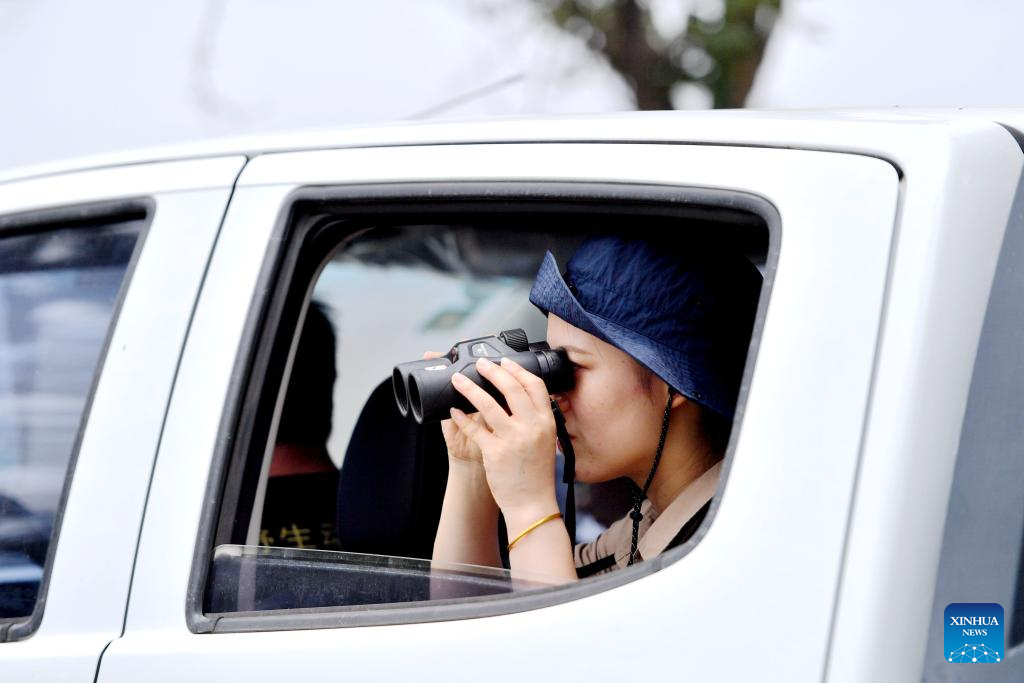 Xue Dandan records condition of milu deer at the Dafeng Milu National Nature Reserve in east China's Jiangsu Province, June 7, 2025.(Xinhua/Cao Yiming)