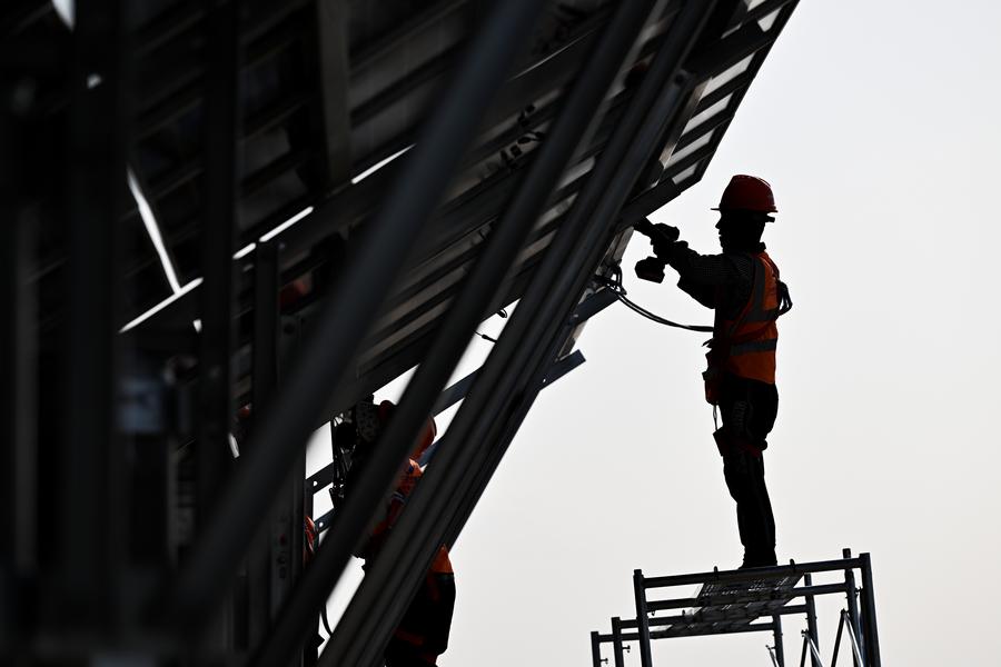 A worker installs photovoltaic panels at a photovoltaic project in Kubuqi Desert, north China's Inner Mongolia Autonomous Region, June 6, 2025. (Xinhua/Li Zhipeng)