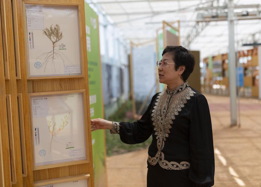 A staff member introduces desert plant specimens at an integrated sand control and photovoltaic project at a state forestry area in the edge of Ulan Buh Desert in Linhe District of Bayannur, north China's Inner Mongolia Autonomous Region, June 5, 2025. (Xinhua/Gao Wei)