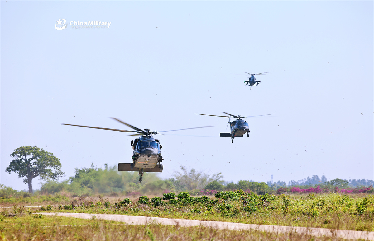 A group of helicopters attached to an army aviation brigade under the Chinese PLA 75th Group Army lift off successively for a flight training exercise in late May, 2025. (eng.chinamil.com.cn/Photo by Cao Yiqing)