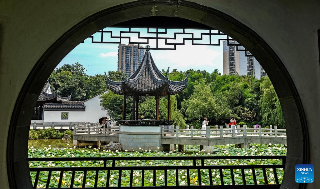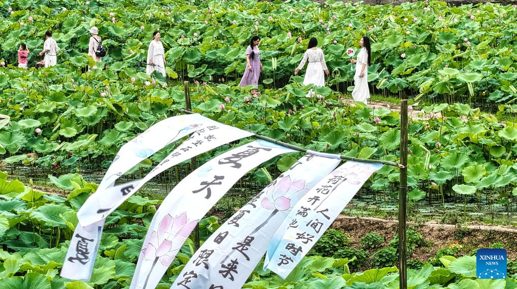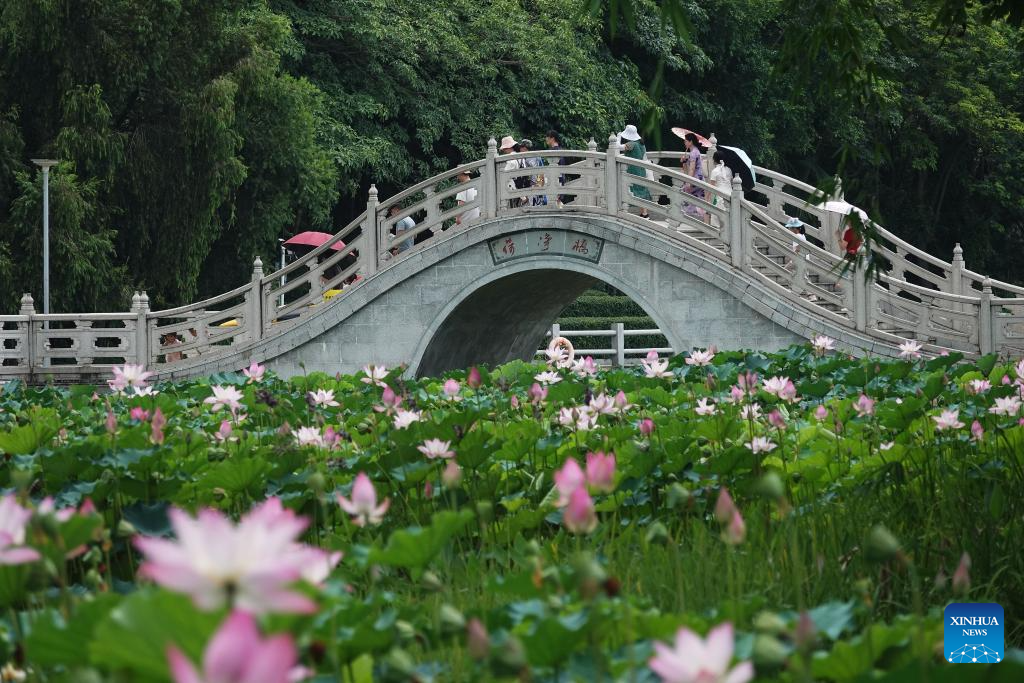 People enjoy lotus flowers at a park in Nanning, south China's Guangxi Zhuang Autonomous Region, June 4, 2025. (Photo by Yu Xiangquan/Xinhua)