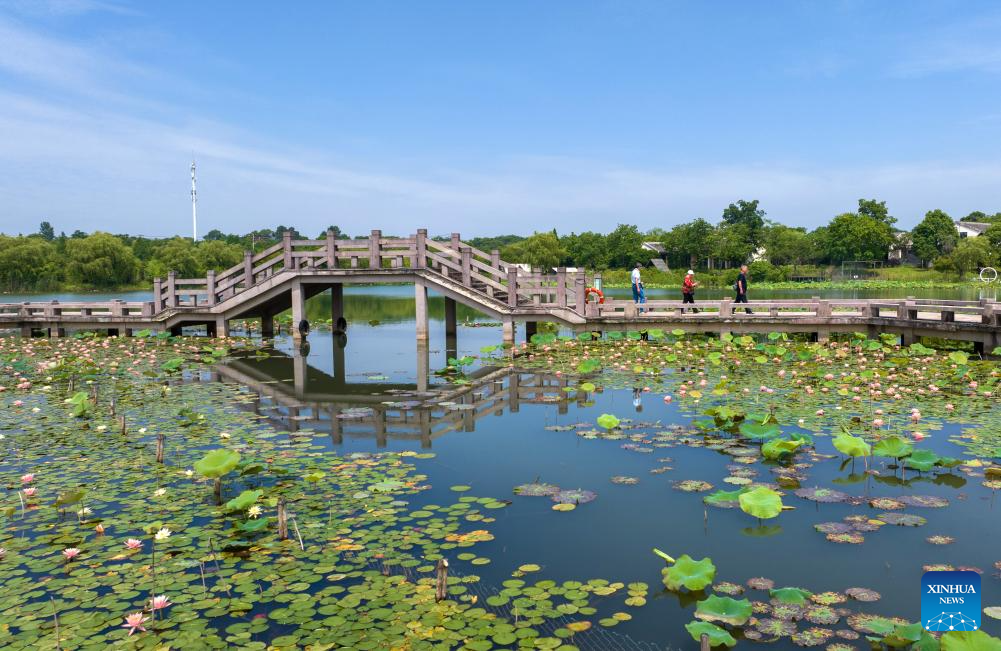 A drone photo taken on June 8, 2025 shows people enjoying lotus flowers at a park in Nanning, south China's Guangxi Zhuang Autonomous Region. (Photo by Yu Xiangquan/Xinhua)