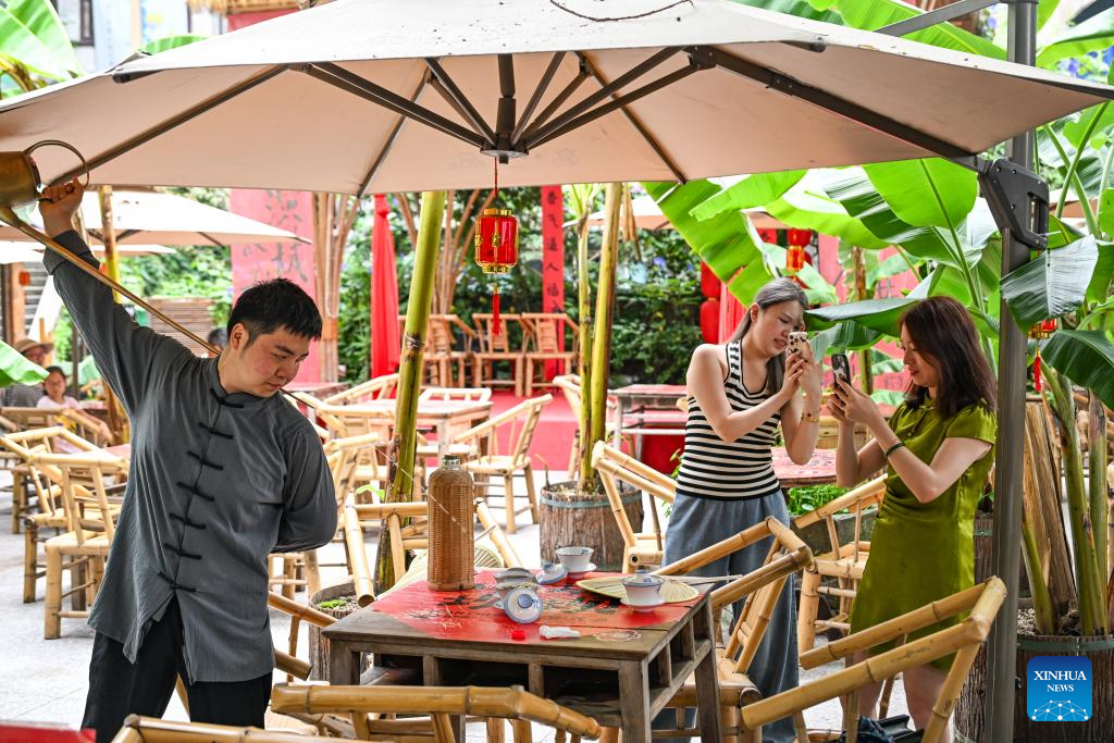 Tourists take photos of tea art performance at a teahouse in Yuzhong District, southwest China's Chongqing Municipality, June 8, 2025. In recent years, Chongqing has made efforts to enrich its consumption forms in line with its existing tourism resources, as a way to provide better consumption experience for customers and unleash market potential. (Xinhua/Wang Quanchao)