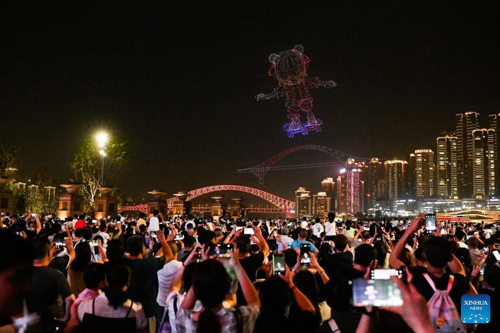 Tourists watch a drone light show on the Chaotianmen Square in southwest China's Chongqing Municipality, May 2, 2025. In recent years, Chongqing has made efforts to enrich its consumption forms in line with its existing tourism resources, as a way to provide better consumption experience for customers and unleash market potential. (Xinhua/Wang Quanchao)