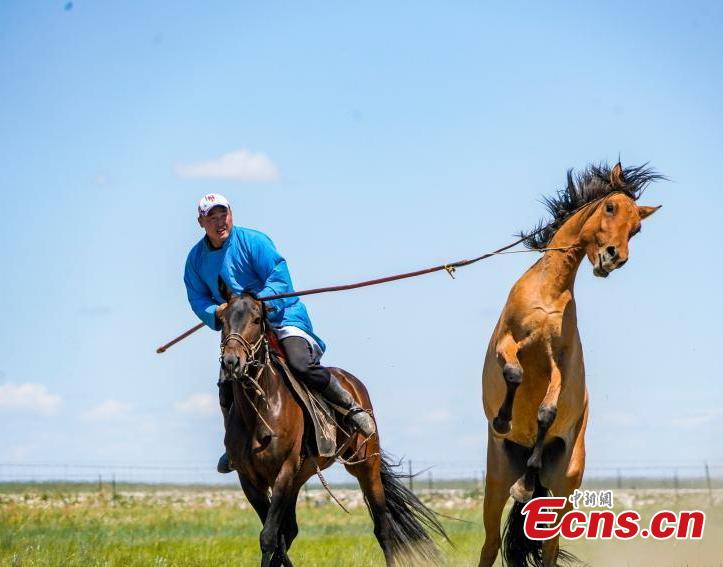 Photo shows a one-to-one showdown between a herder and a horse in Xilin Gol League of north China's Inner Mongolia Autonomous Region. (China News Service/Wang Zhiwei)