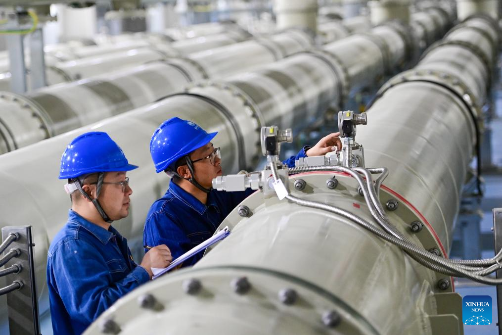 Staff members check equipment at the Barkol converter station, the sending end of the Hami-Chongqing ±800 kV ultra-high voltage direct current transmission project, in Hami, northwest China's Xinjiang Uygur Autonomous Region, June 10, 2025. The State Grid Corporation of China on Tuesday announced the operation of the ±800 kV ultra-high voltage direct current transmission project linking eastern Xinjiang's Hami with southwest China's Chongqing Municipality.