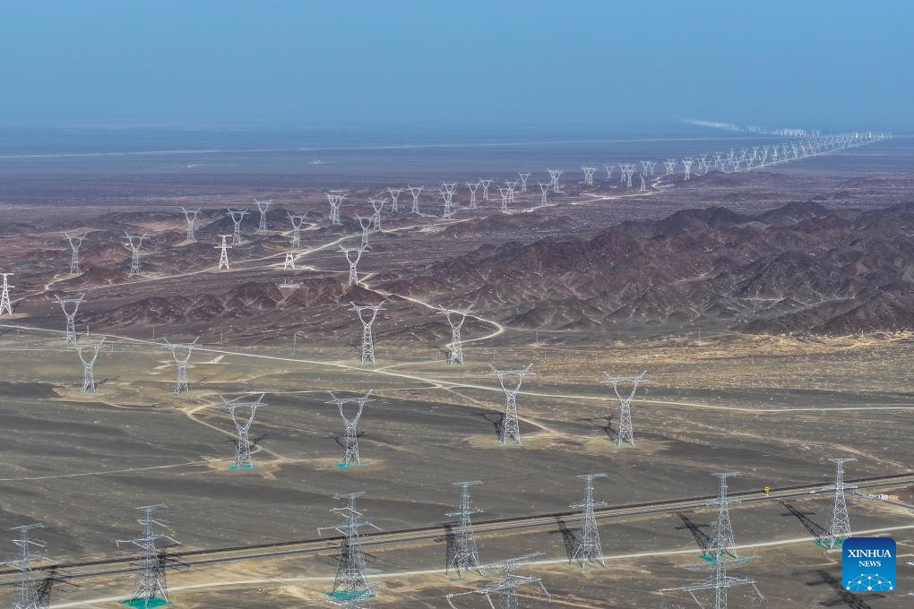 An aerial drone photo shows a view of the Xinjiang section of the Hami-Chongqing ±800 kV ultra-high voltage direct current transmission project, in Hami, northwest China's Xinjiang Uygur Autonomous Region, Oct. 30, 2024. The State Grid Corporation of China on Tuesday announced the operation of the ±800 kV ultra-high voltage direct current transmission project linking eastern Xinjiang's Hami with southwest China's Chongqing Municipality.