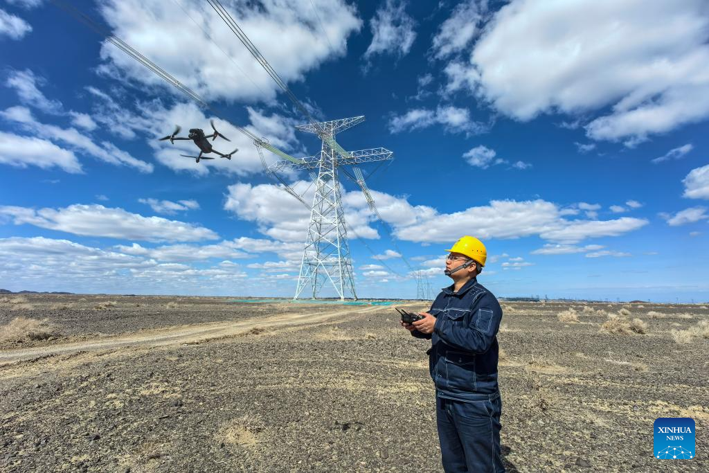 A staff member operates a drone to check cables of the Hami-Chongqing ±800 kV ultra-high voltage direct current transmission project, in Hami, northwest China's Xinjiang Uygur Autonomous Region, April 3, 2025. The State Grid Corporation of China on Tuesday announced the operation of the ±800 kV ultra-high voltage direct current transmission project linking eastern Xinjiang's Hami with southwest China's Chongqing Municipality.