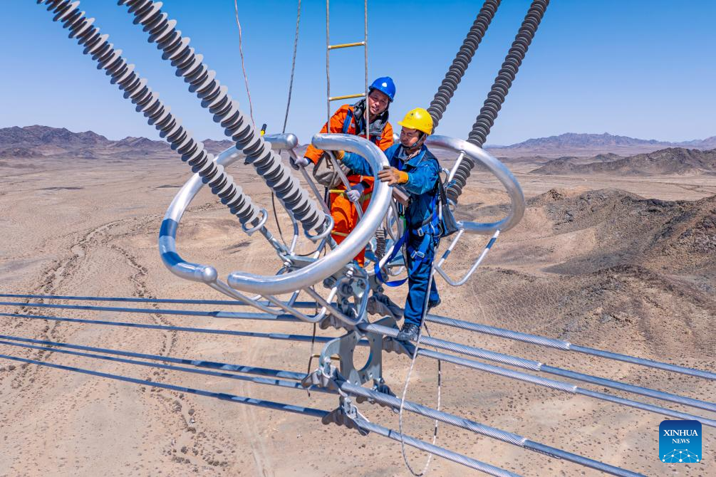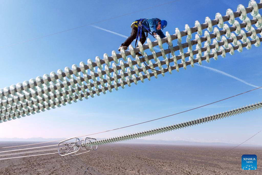An aerial drone photo shows staff checking cables of the Hami-Chongqing ±800 kV ultra-high voltage direct current transmission project, in Hami, northwest China's Xinjiang Uygur Autonomous Region, April 8, 2025. The State Grid Corporation of China on Tuesday announced the operation of the ±800 kV ultra-high voltage direct current transmission project linking eastern Xinjiang's Hami with southwest China's Chongqing Municipality.