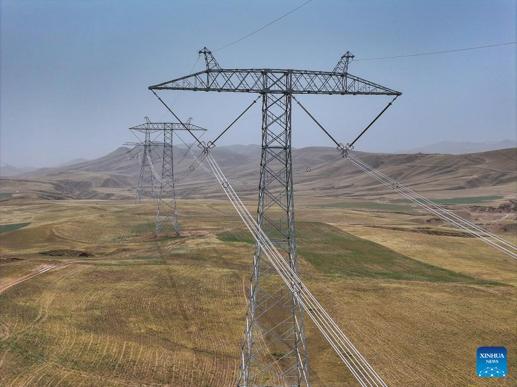 An aerial drone photo shows a view of the Hami-Chongqing ±800 kV ultra-high voltage direct current transmission project in Wuwei City, northwest China's Gansu Province, May 29, 2025. The State Grid Corporation of China on Tuesday announced the operation of the ±800 kV ultra-high voltage direct current transmission project linking eastern Xinjiang's Hami with southwest China's Chongqing Municipality.