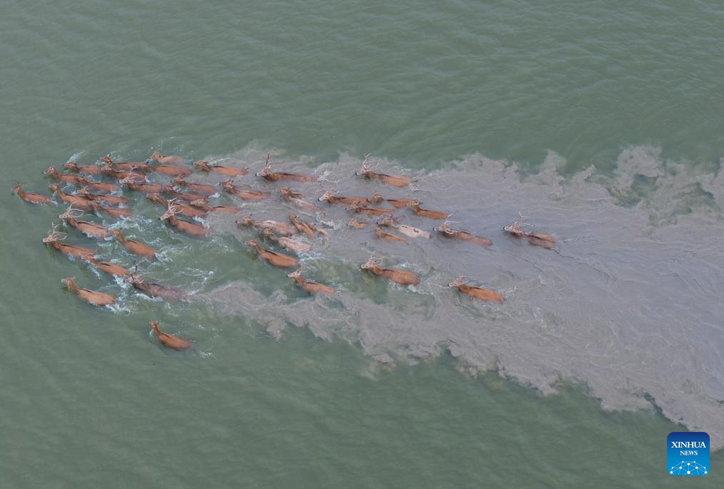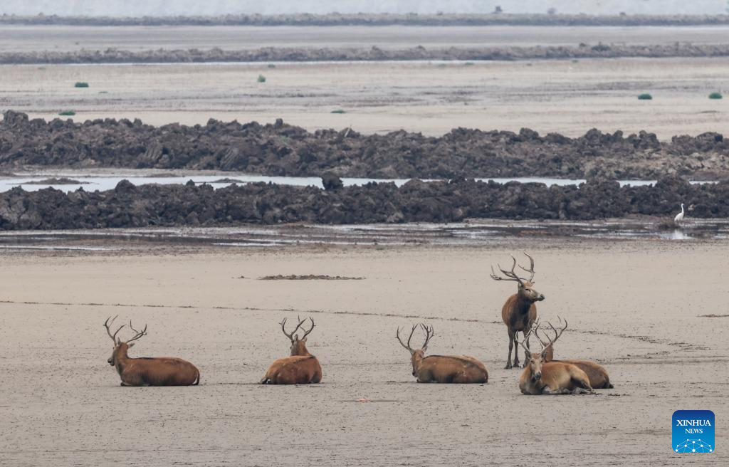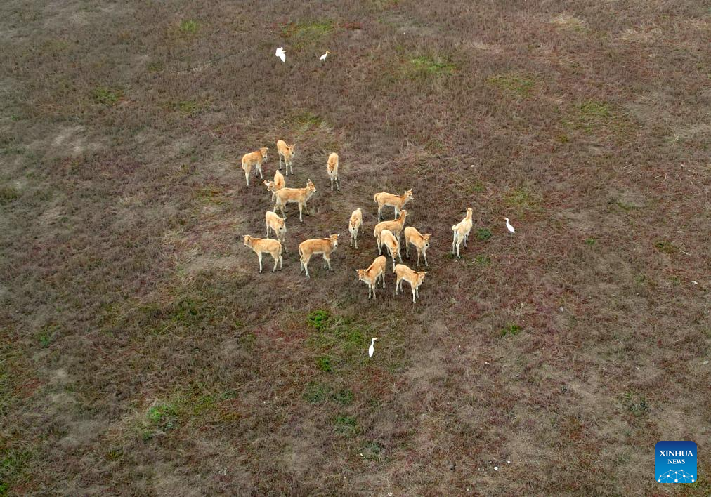 By the end of 2024, the milu deer population in the Yancheng reserve area had reached over 8,200, accounting for nearly 70 percent of the global milu deer population. (Xinhua/Cheng Tingting)
