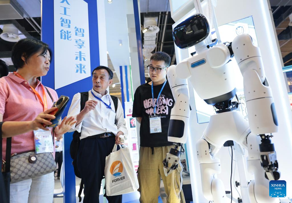 Visitors talk near a humanoid robot displayed during the 11th China (Shanghai) International Technology Fair (CSITF) in east China's Shanghai, June 11, 2025. The 11th CSITF kicked off here on Wednesday. With an exhibition area covering 35,000 square meters, this year's fair features four themed exhibition areas, a trading service area and a trading facilitation events area. Some 1,000 exhibitors from nearly 20 countries and regions showcased their innovative achievements here. (Xinhua/Fang Zhe)