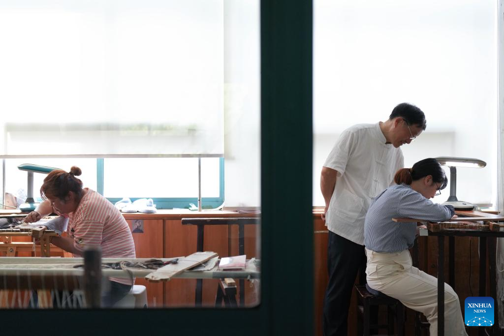 Chen Boyu guides an apprentice at the Jiali hair embroidery factory in Dongtai City, Yancheng of east China's Jiangsu Province, June 6, 2025. (Xinhua/Xue Yuge)