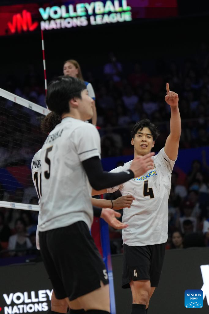 Miyaura Kento (R) of Japan celebrates during the Pool 3 match between China and Japan at the Men's Volleyball Nations League (VNL) 2025 in Xi'an, northwest China's Shaanxi Province, June 11, 2025. (Xinhua/Li Yibo)