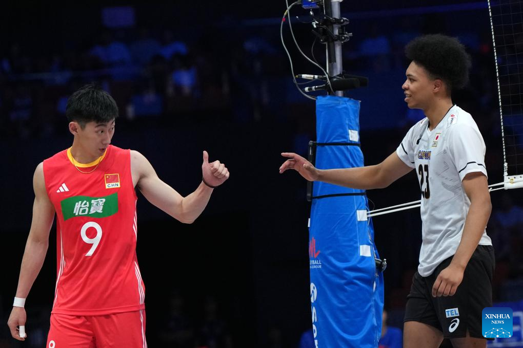 Larry Ik Evbade-Dan (R) of Japan checks on Li Yongzhen of China during the Pool 3 match between China and Japan at the Men's Volleyball Nations League (VNL) 2025 in Xi'an, northwest China's Shaanxi Province, June 11, 2025. (Xinhua/Li Yibo)