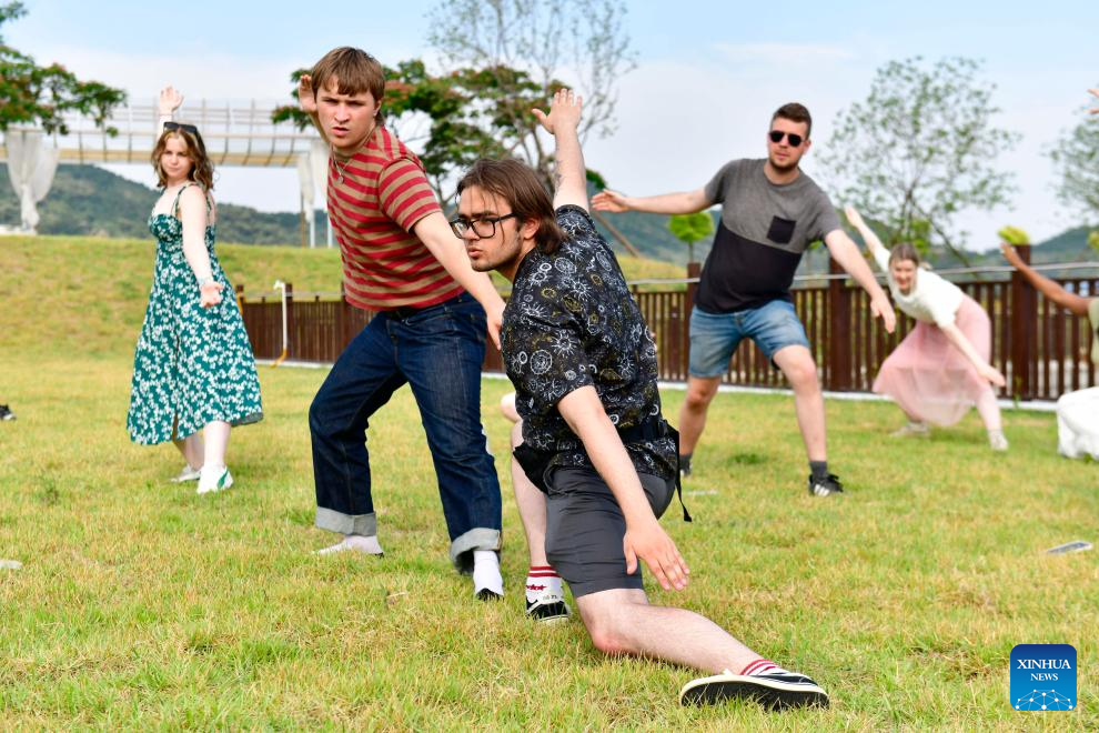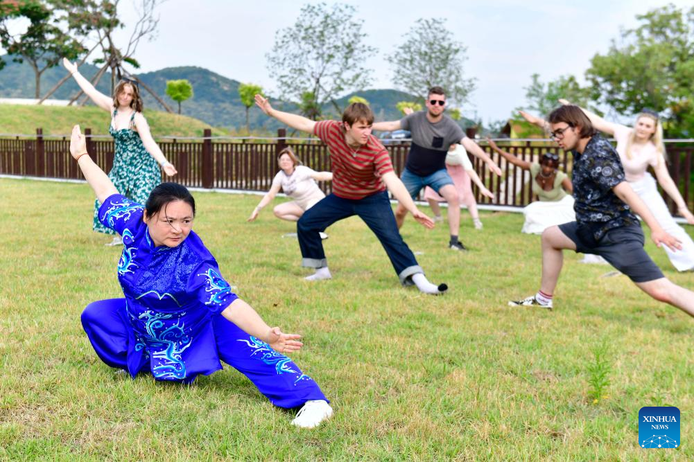 Students from Leeds Beckett University learn martial arts from a Chinese teacher at a training base in Wulian County, Rizhao City, east China's Shandong Province, June 10, 2025. Faculties and students from the Leeds Beckett University of the UK and the Rizhao Polytechnic in Shandong held an exchange camp in Rizhao, where the attendees shot video clips and experienced traditional Chinese culture such as martial arts and tie-dyeing. The two institutions are now jointly hosting a professional training program on digital media art designing. (Xinhua/Guo Xulei)