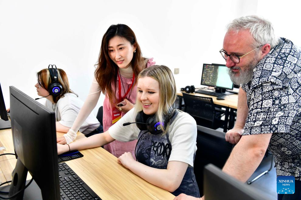 Students from Leeds Beckett University learn video editing skills at Rizhao Polytechnic in Rizhao City, east China's Shandong Province, June 11, 2025. Faculties and students from the Leeds Beckett University of the UK and the Rizhao Polytechnic in Shandong held an exchange camp in Rizhao, where the attendees shot video clips and experienced traditional Chinese culture such as martial arts and tie-dyeing. The two institutions are now jointly hosting a professional training program on digital media art designing. (Xinhua/Guo Xulei)