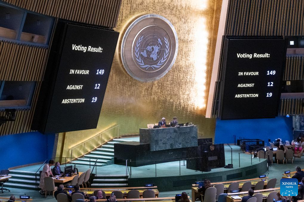 UNITED NATIONS, June 12 (Xinhua) -- The General Assembly, at an Emergency Special Session, adopted a resolution on Thursday that demands an immediate ceasefire in Gaza and immediate access to humanitarian assistance at scale.