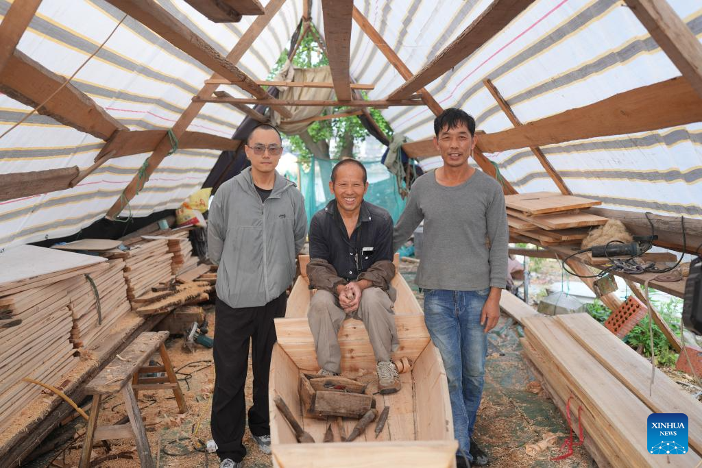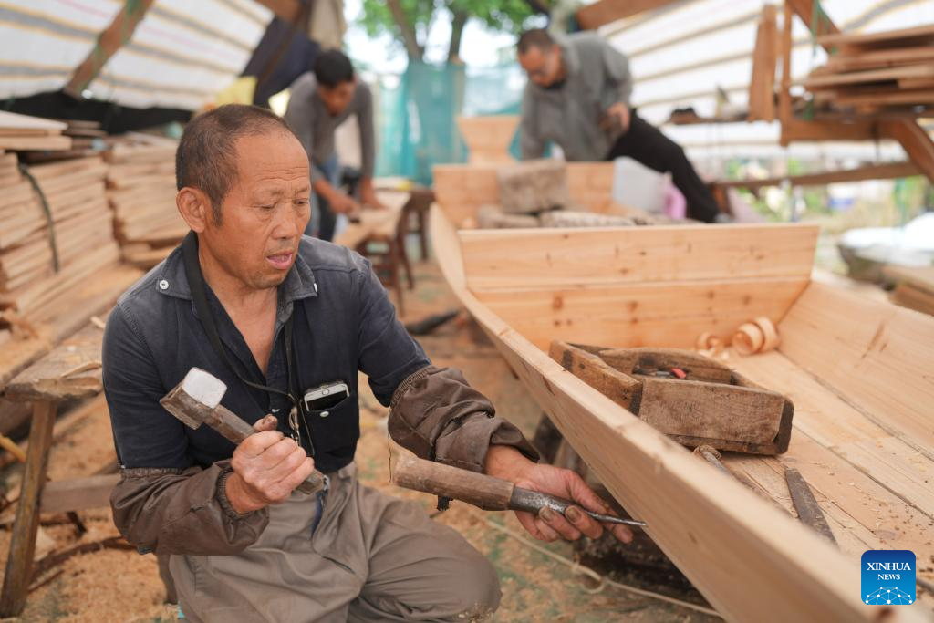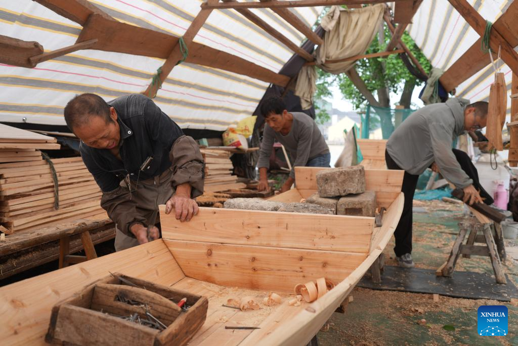 Qian Shoutang makes a black-awning boat with his apprentices in Shaoxing, east China's Zhejiang Province, June 12, 2025. The black-awning boat is unique transportation means in Shaoxing with a long history. The making technique of the black-awning boat was inscribed on the list of provincial intangible cultural heritage of Zhejiang in 2009. Qian Shoutang, 68, is a representative inheritor of the technique in Shaoxing. Born in a family with a black-awning boat making tradition, Qian has engaged himself in making boats for over half a century. Currently, Qian and his apprentices make more than ten black-awning boats each year, primarily for use in scenic areas. "As more and more people, especially young generation, are fascinated with traditional culture, it is meaningful for me to pass down the technique," said Qian. (Xinhua/Weng Xinyang)
