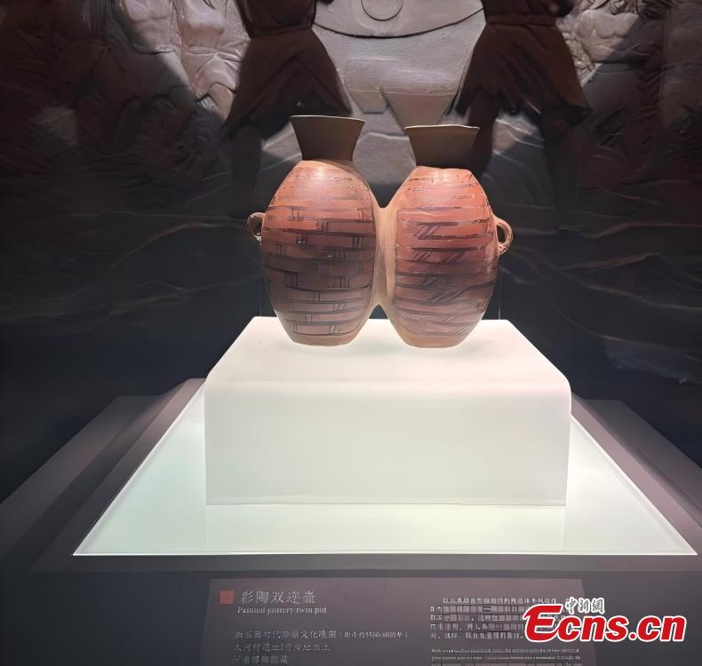 Photo taken on June 11, 2025, shows that a painted pottery double-spouted jug is on display at the Dahecun Site Museum in Zhengzhou, central China's Henan Province. (China News Service/Wang Jianing)