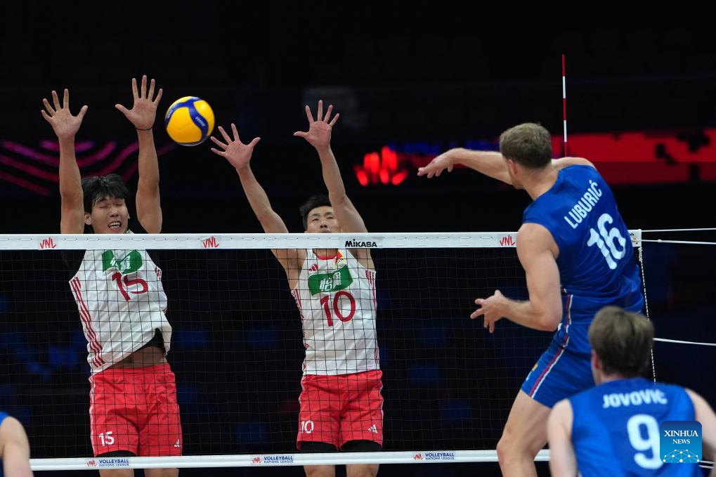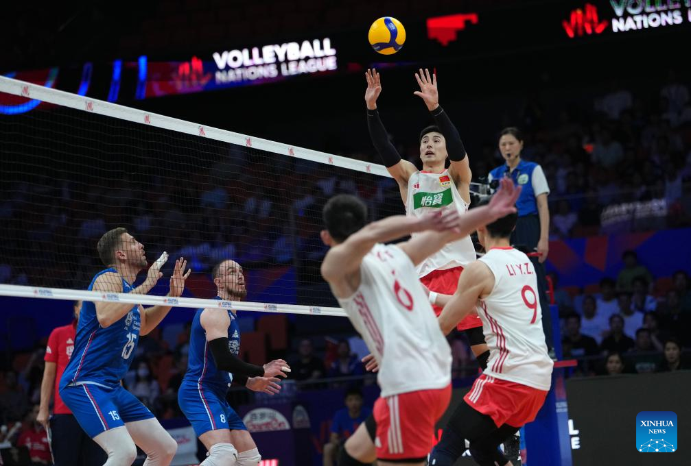 XI'AN, June 12 (Xinhua) -- World 24th-ranked China celebrated its head coach Vital Heynen's 56th birthday by breaking the curse to defeat Serbia in straight sets at the Volleyball Nations League (VNL) Xi'an leg on Thursday.