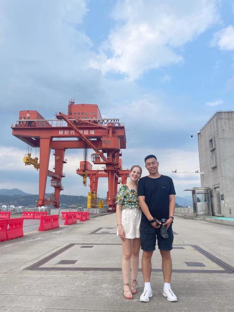 Italian vlogger Rachele Longhi (L) and her Chinese husband Luca pose for a photo at the Three Gorges Dam in central China's Hubei Province in 2022. (Xinhua)