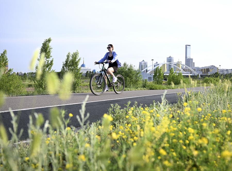 A woman rides a bike at the Triathlon Park in Astana, Kazakhstan, June 11, 2025. (Xinhua/Yan Yan)