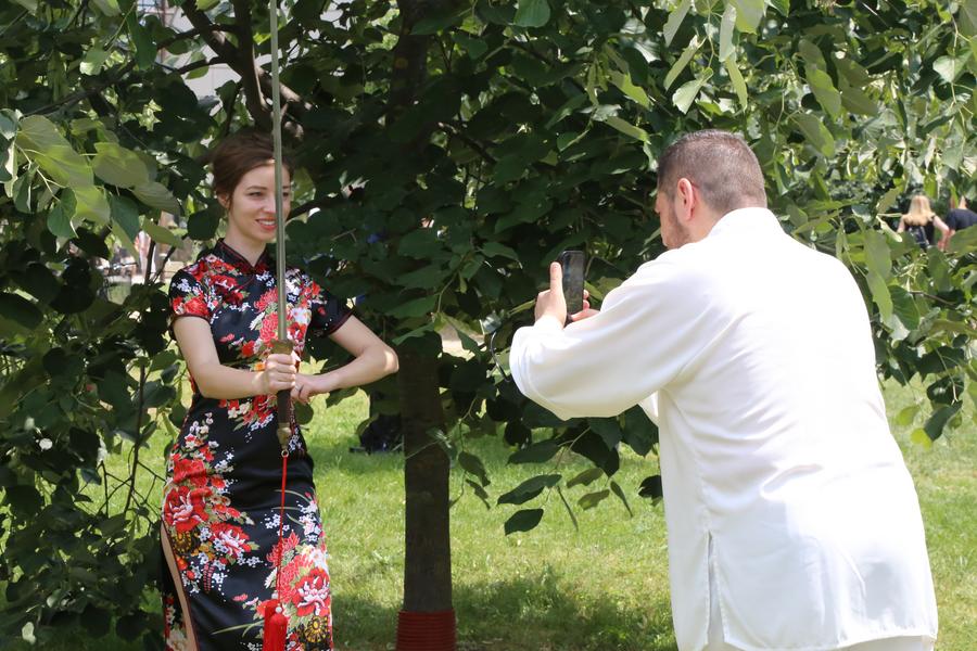 A woman in Chinese costumes holding a Chinese sword poses for photos at the Asian Festival in Sofia, Bulgaria, June 14, 2025. (Xinhua/Lin Hao)