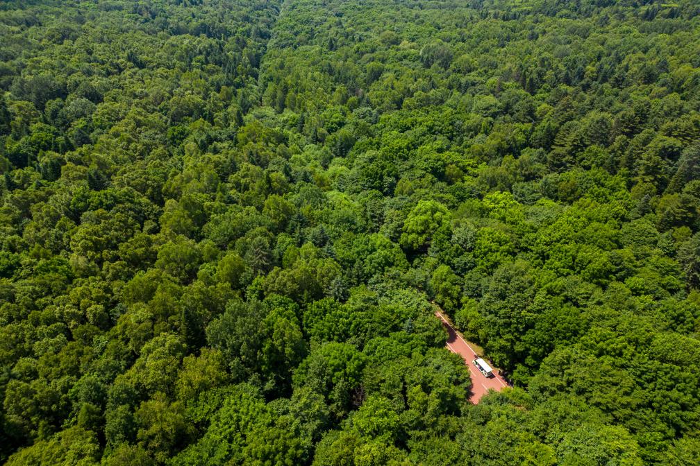 An aerial drone photo taken on July 11, 2024 shows a vehicle running in Shangganling stream forest park in Yichun, northeast China's Heilongjiang Province. As the eastern part of the Three-North Shelterbelt Forest Program (TSFP), a large-scale afforestation project, northeast China has seen continuous improvement of ecological environment. (Xinhua/Zhang Tao)