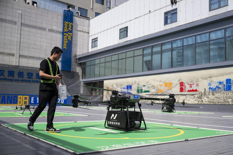 A staff member loads cargos onto a drone at Hanshang Low-altitude Airfield in Wuhan, central China's Hubei Province, June 16, 2025. (Xinhua/Wu Zhizun)