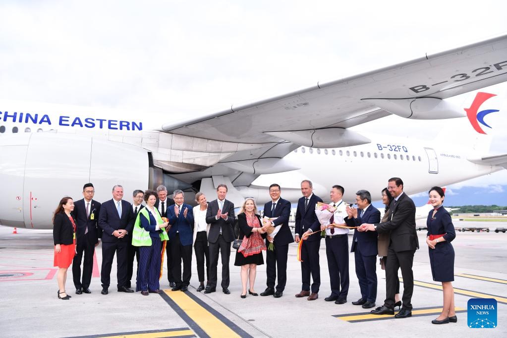 A ribbon-cutting ceremony of China Eastern Airlines' inaugural direct flight linking Shanghai with Geneva is held in Geneva, Switzerland, June 16, 2025. (Xinhua/Lian Yi)