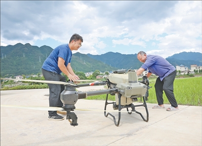 Zhou Huiming (left), an executive of an agricultural service company, adjusts a plant protection drone with veteran farmer Zheng Yuehua near a rice field in Xinxing township, Songyang county, Lishui city, east China's Zhejiang Province. (Photo/Zhou Minlan)