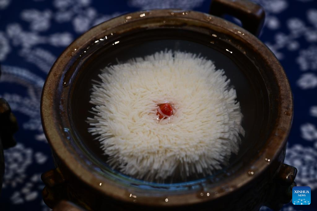 This photo taken on April 8, 2025 shows the "Chrysanthemum-shaped tofu" made by Zhang Shihong, an inheritor of the tofu banquet making skills, in Shouxian County, Huainan City, east China's Anhui Province. (Xinhua/Zhou Mu)