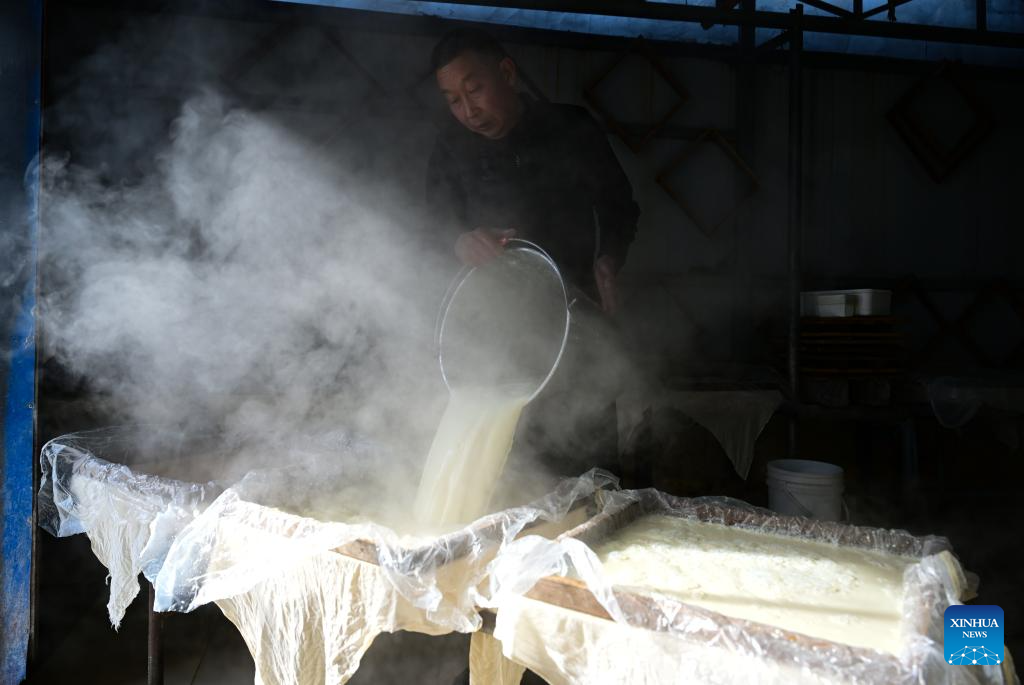 Hu Xuebing, a provincial intangible cultural heritage representative inheritor of the traditional tofu making skills, makes tofu at Daquan Village in Shouxian County, Huainan City, east China's Anhui Province, Jan. 15, 2025. (Xinhua/Zhou Mu)