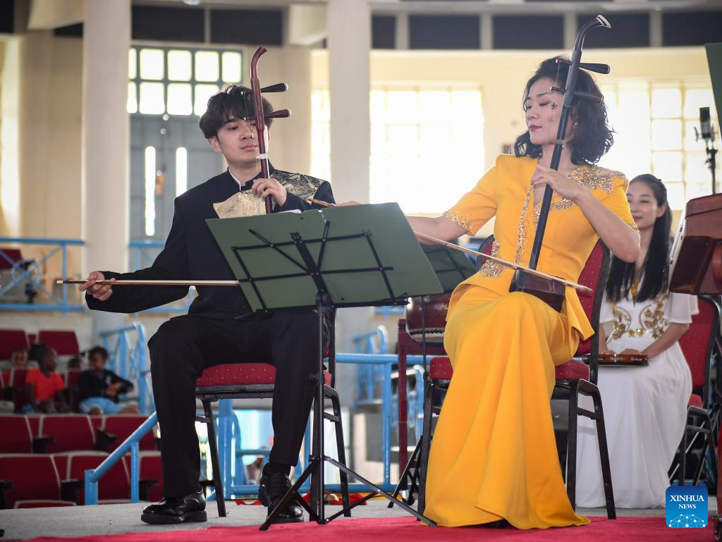 Dressed in colorful traditional attire, a 14-member touring troupe from east China's Shandong Normal University showcased their mastery of instruments such as the guitar, flute, and saxophone, weaving enchanting melodies that resonated deeply with the audience.