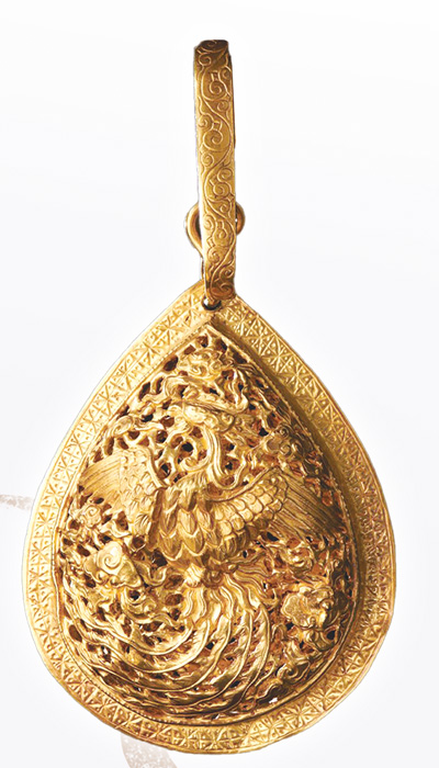 Photo shows a gold openwork phoenix-pattern eardrop from the Ming dynasty (1368-1644) held in the Hubei Provincial Museum, central China's Hubei Province. (Photo courtesy of Lu Li)