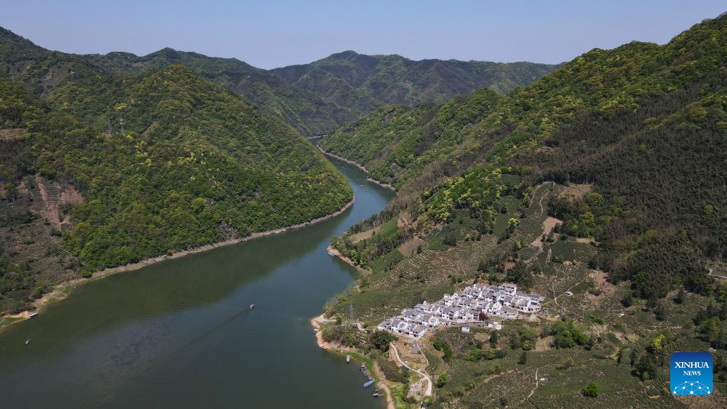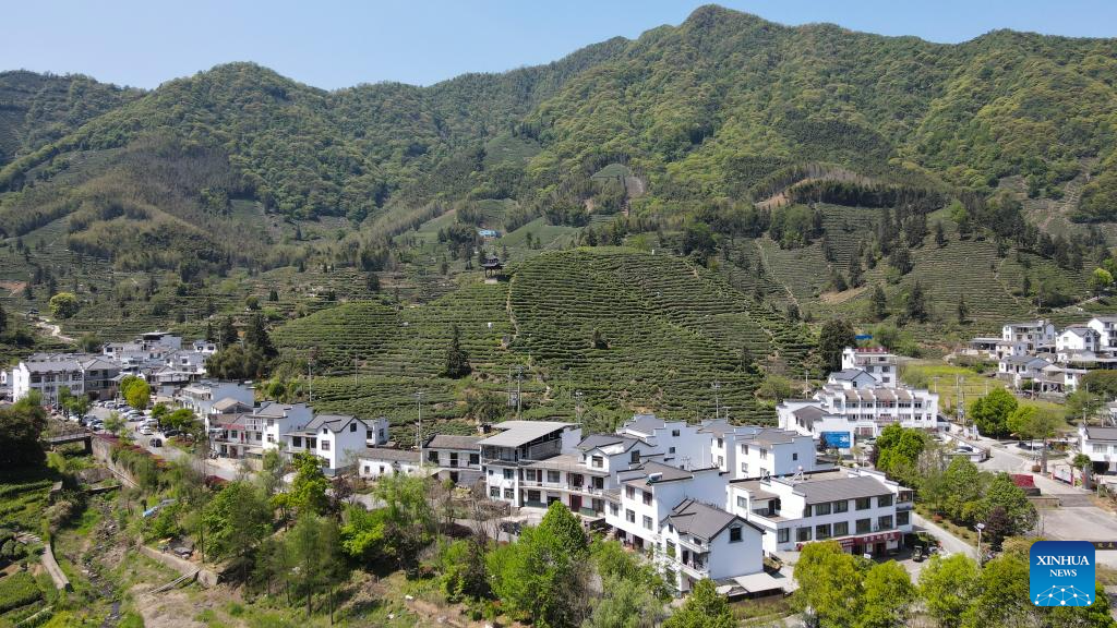 An aerial drone photo shows a view of Houkeng Village of Huangshan, east China's Anhui Province, April 15, 2025.