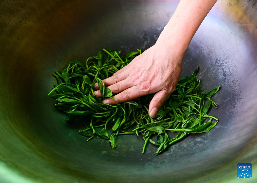 A worker processes tea leaves in Houkeng Village of Huangshan, east China's Anhui Province, April 15, 2025.