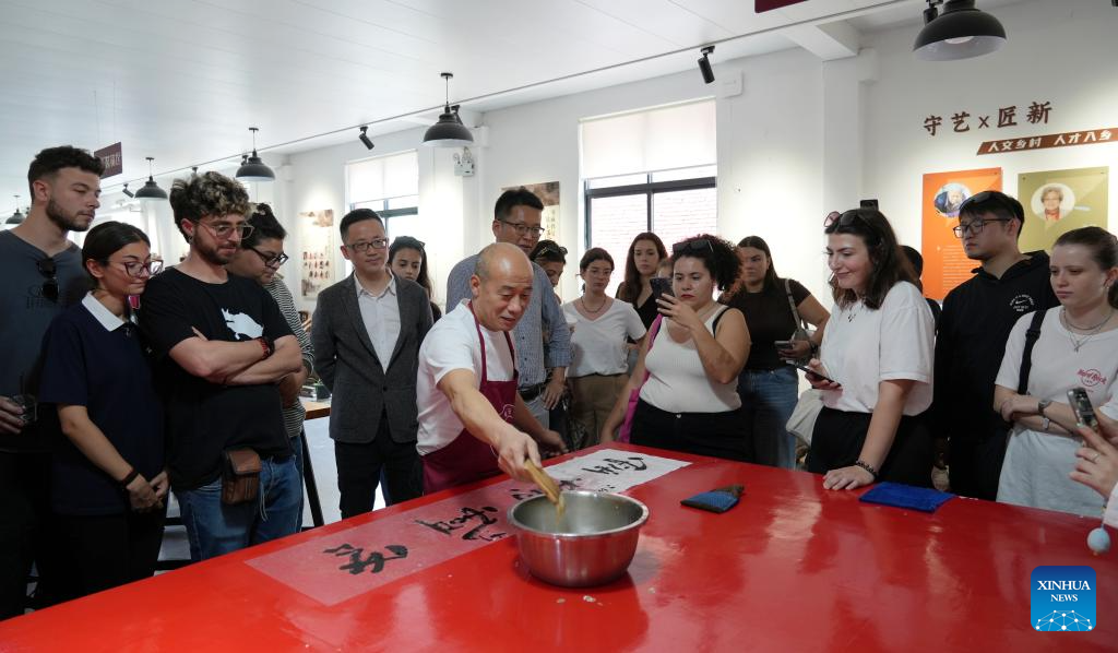 A group of international students majoring in Chinese studies at Zhejiang University learn the steps of mounting and restoring Chinese paintings at Wu Jianjiang's workshop in Tianshi Township, Xianju County, Taizhou City, east China's Zhejiang Province, April 30, 2025. (Xinhua)