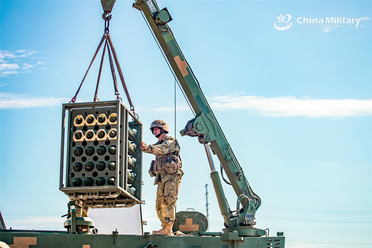 A soldier assigned to a brigade under the Chinese PLA 73rd Group Army hoist and load shells onto the predetermined position of a launching device during an ammunition hoisting operation. (eng.chinamil.com.cn/Photo by Xiao Zubin)