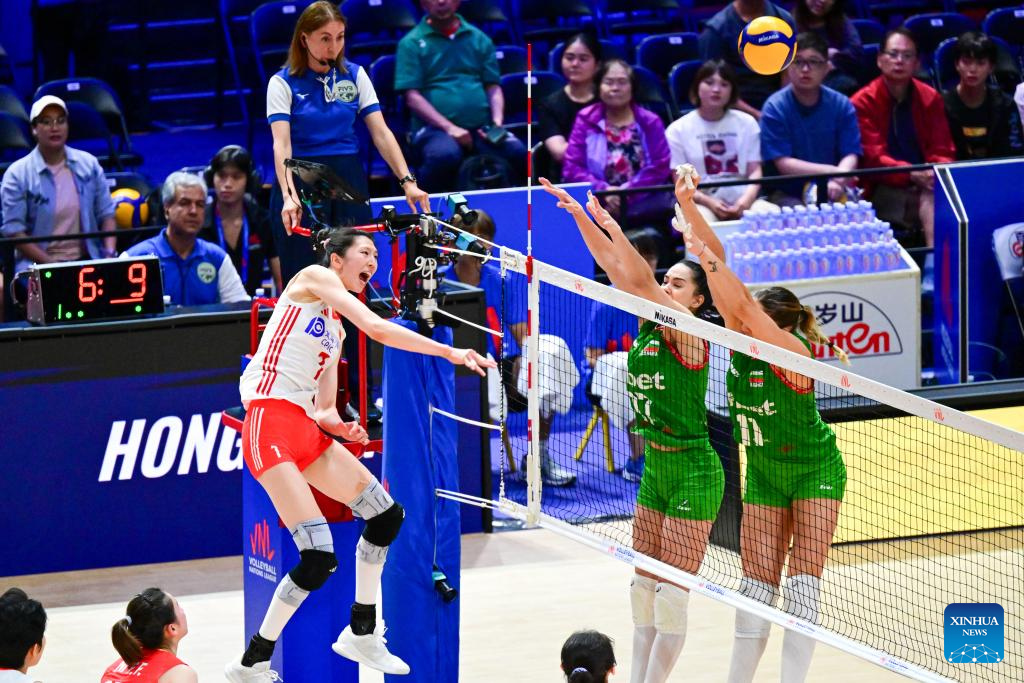 Wang Yuanyuan (2nd R) of China spikes the ball during the Pool 5 match between China and Bulgaria at the Women's Volleyball Nations League (VNL) 2025 in Hong Kong, south China, June 19, 2025. (Xinhua/Zhu Wei)