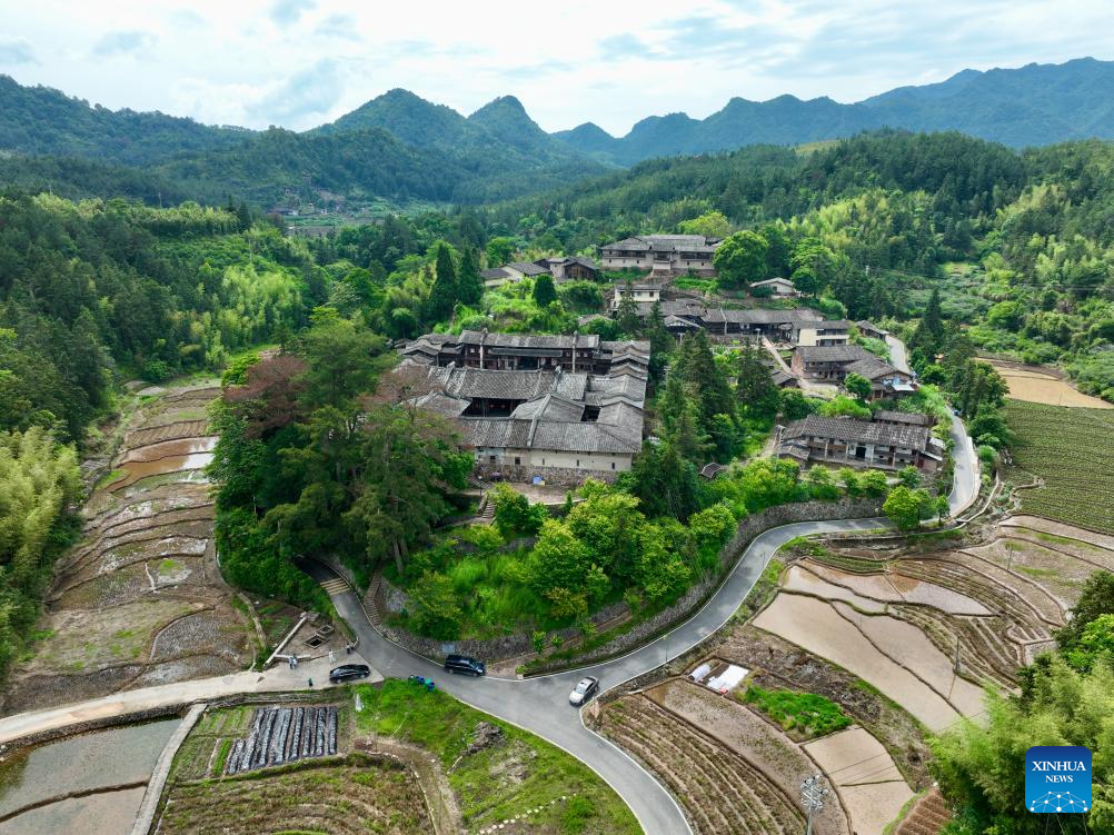 An aerial photo taken on May 20, 2025 shows Zhutou Manor in Yongtai County, southeast China's Fujian Province. Nestled in the Daiyun Mountain like scattered pearls, over 2,000 fortified manors in Yongtai County trace their origins to the Tang Dynasty (618-907 AD), flourishing later during the Ming (1368-1644) and Qing (1644-1911) eras.