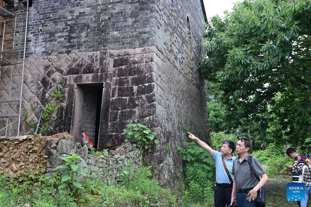 A conservation expert (2nd L) conducts a survey at Hecheng Manor in Yongtai County, southeast China's Fujian Province, on May 20, 2025. Nestled in the Daiyun Mountain like scattered pearls, over 2,000 fortified manors in Yongtai County trace their origins to the Tang Dynasty (618-907 AD), flourishing later during the Ming (1368-1644) and Qing (1644-1911) eras.