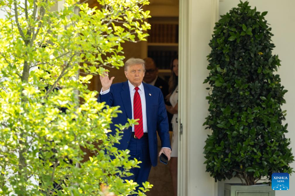 U.S. President Donald Trump waves to the press as he walks toward the South Lawn to board Marine One at the White House in Washington, D.C., the United States, on June 20, 2025. Trump said Friday it will be difficult to request Israel stop its airstrikes in Iran, even as he pursues a diplomatic solution to end the conflict. (Xinhua/Hu Yousong)